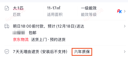 您选购有“六年质保”标识的第三方卖家商品,自订单确认收货次日零时起(安装类商品自商品安装完成之日起计算),如商品在6年内出现质量问题或性能故障,当您申请售后维修时,卖家将根据商品出现的具体问题,为您提供免费维修、退货退款、换货、免费补寄零配件、维修费用补偿等形式的售后保障服务,具体以售后审核结果为准。